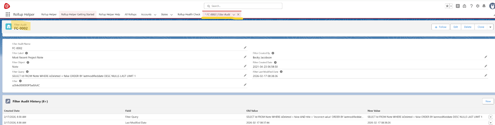 Filter Auditing – Now you can track changes made to filters or track field history on rollups via the PS_Filter_Audit__c and PS_Filter_Audit_History__c objects. No configuration is necessary, and a link to the Filter Audit record is located on the filter’s editor page. (See the image below.)